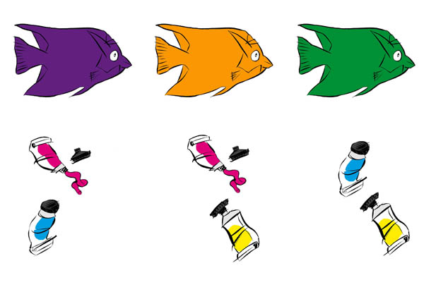 Este pequeño ejercicio es una excelente oportunidad para familiarizarte mejor con la pintura y los colores. Utiliza unos tubos de acuarela (magenta, cian y amarillo) que están en tus cajones, un pincel y una hoja de papel Canson® C à Grain.