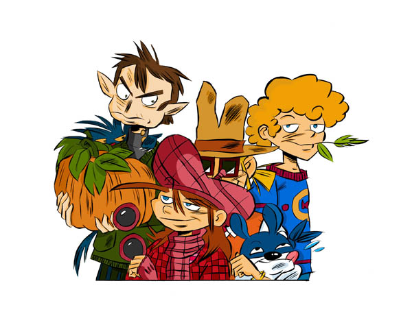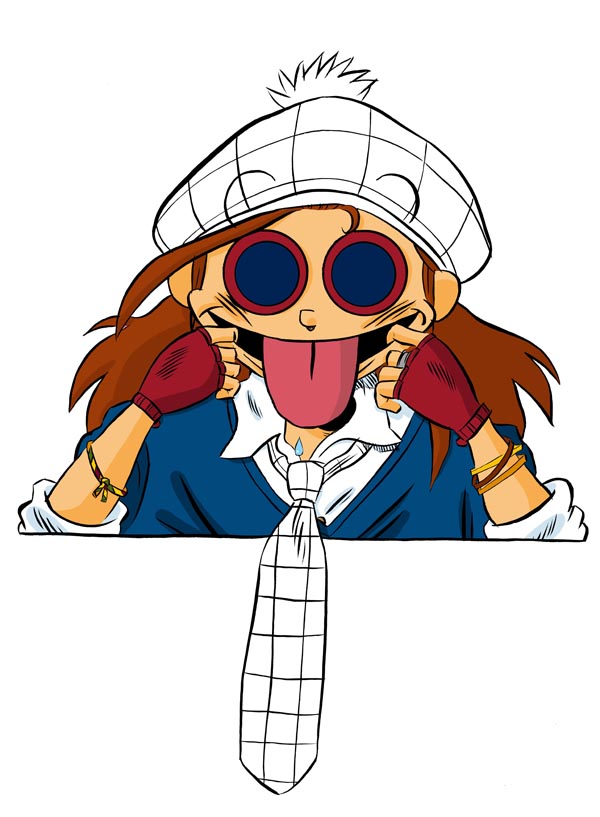 ¿El secreto para tener éxito aplicando colores? No utilizar demasiados colores diferentes para que tu dibujo conserve una unidad. Aquí, por ejemplo, el rosa de la lengua se relaciona con el color de los guantes y de las gafas. El azul de las gafas se relaciona con el suéter. Incluso los detalles como las pequeñas pulseras son sobrias y tienen colores que evocan el resto del personaje.
