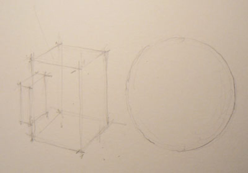 Puedes utilizar dos lápices distintos (por ejemplo: lápices 2B y 9B o un bastoncillo de sanguina y un lápiz 2B). Con uno trazarás la forma geométrica, con el otro precisarás la forma del objeto. Así, visualizarás más fácilmente la evolución entre el trazado inicial y el final.