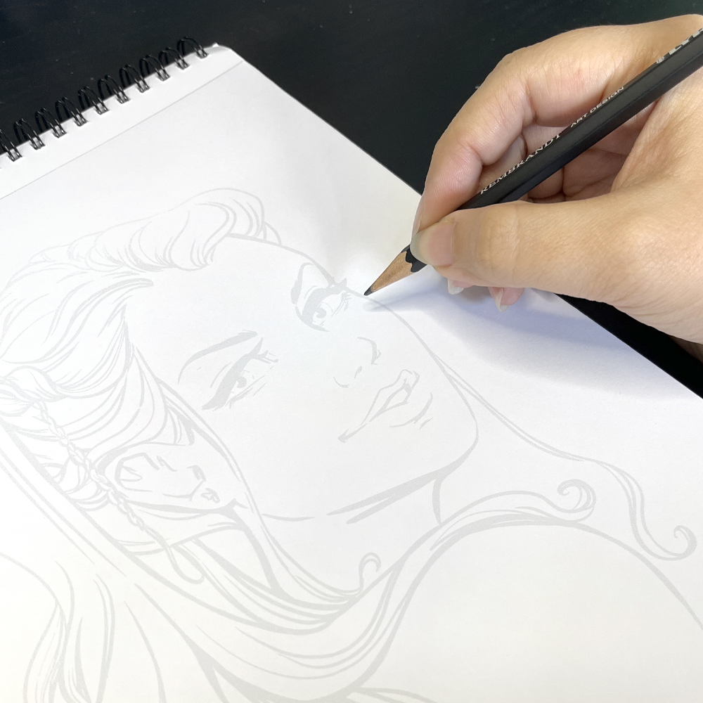 Consejo: puedes hacer una fotocopia del dibujo para quedarte con el modelo al que le has dedicado más tiempo y hacer pruebas de color. Otra opción es limpiar el dibujo utilizando papel de calco o una mesa de luz, de modo que solo se conserven las líneas limpias de la ilustración y el papel no se dañe al borrar.