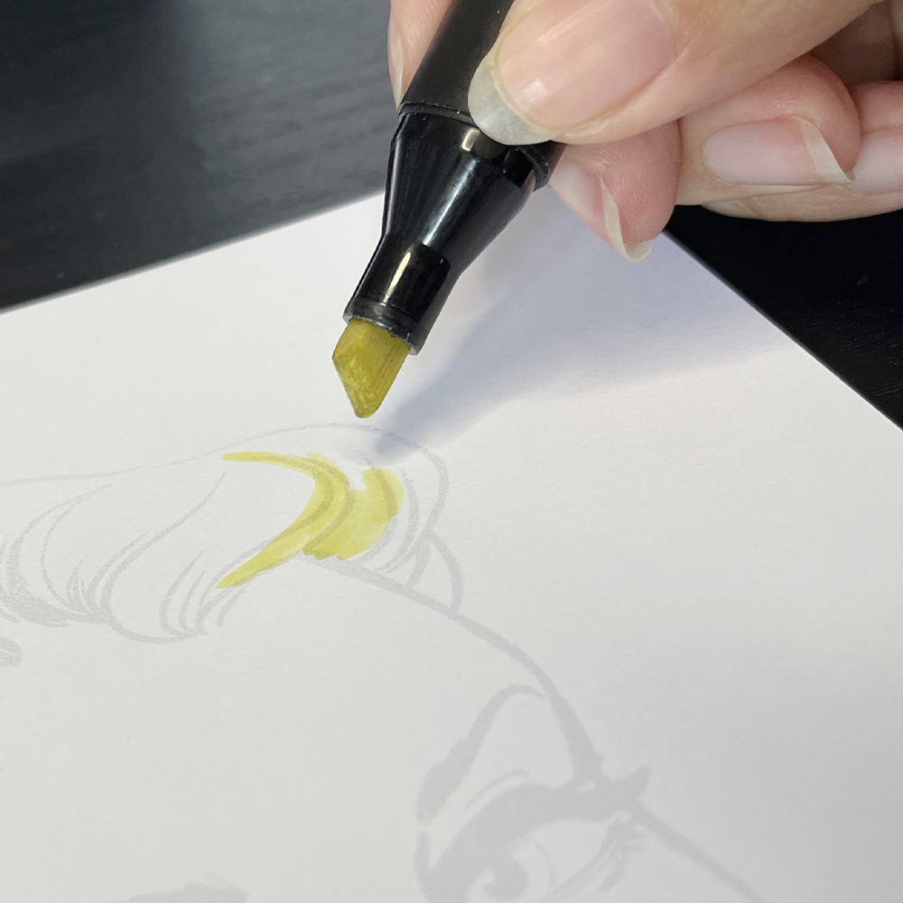 Utiliza un tono amarillo claro para darle un toque de color que armonice todo el peinado y resalte la silueta del personaje.