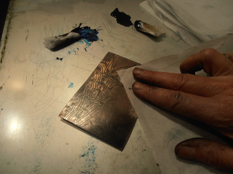 Con un pedazo de tarlatana, plegado hasta conseguir una bola, limpia la lámina, primero con vigor y cada vez más despacio a medida que el dibujo va apareciendo.