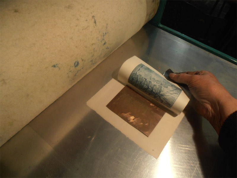 Deposita la hoja de papel húmedo sobre la lámina entintada y baja los fieltros antes de poner la prensa en funcionamiento.