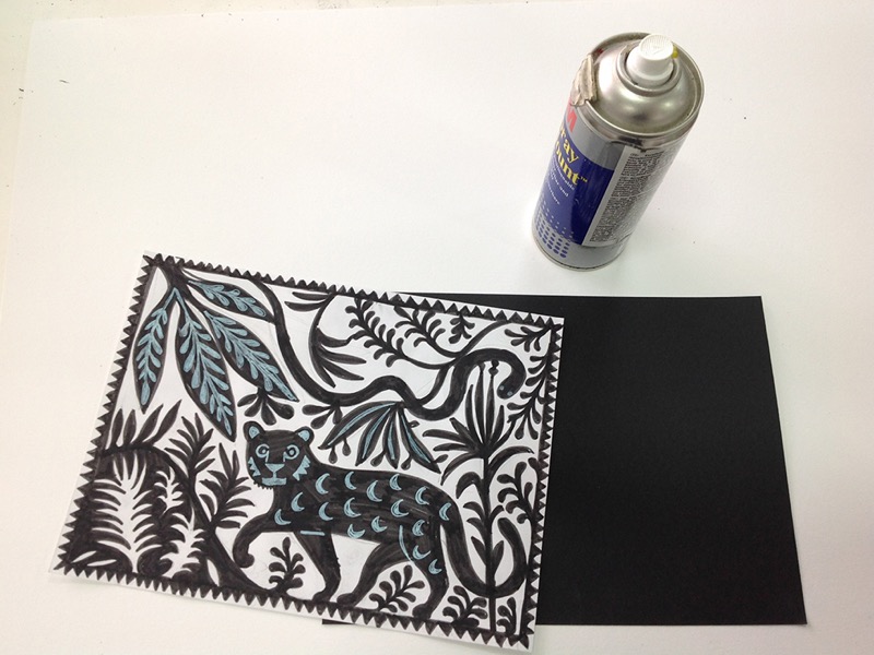 Utilizando el pegamento en spray de quita y pon, pega el patrón al papel negro. Vaporiza suavemente y pega las dos hojas borde con borde.