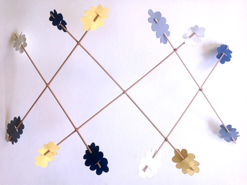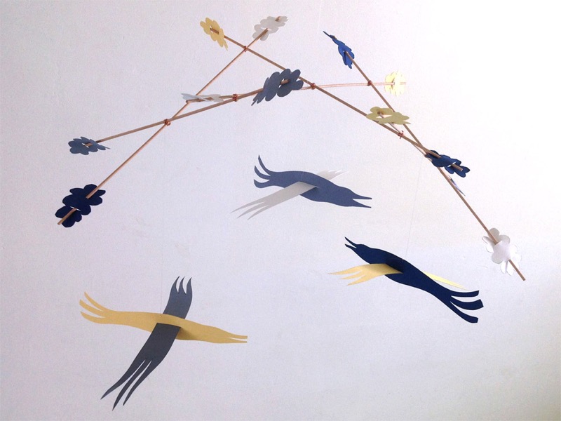 ¿Qué es más ligero que un cielo lleno de pájaros y de nubes para crear un móvil suspendido? La ligereza del papel y de las varillas de haya permitirán que el móvil gire ligeramente en el aire, aportando a tu decoración un toque poético.