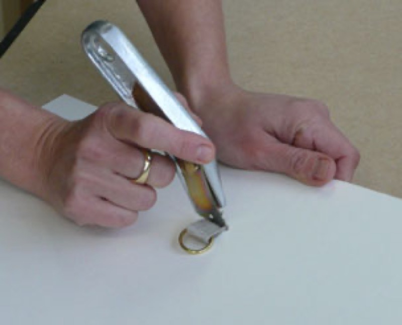 El más sencillo es la anilla enganchada al cartón de fondo del marco mediante una cinta de lino trenzado. Duplica este sistema para los formatos que superen los 30 x 40 cm. Para las obras más pesadas, es conveniente equiparlas con anillas remachadas o pintones redondos cerrados, fijados a la moldura del marco.