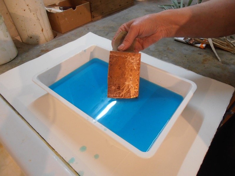 - Accesorios: bola de barniz blando, cubeta de plástico, ácido nítrico diluido al 50% en agua, lámina de cobre de 8 cm x 5 cm, tubo de tinta para calcografía de color sepia, tarlatana, aguarrás, lámpara de alcohol, parrilla, hoja de rhodoïd, prensa de tipo tórculo y distintos vegetales y tejidos.