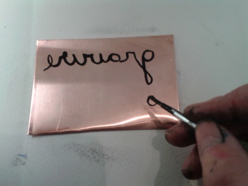 Una vez terminado el dibujo, sumergimos la lámina de metal en un baño de ácido o de percloruro de hierro. El metal está "mordido" allí donde se ha retirado el barniz; cuanto más tiempo dejemos la lámina en el ácido, más profunda será la mordida, ya que el ácido solo ataca las partes donde el cobre no está protegido. Dado que la tinta entra en los huecos, aparecerá sobre el papel después de pasar por la prensa.