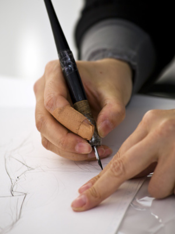 Más económico que el rapidógrafo, el tiralíneas es igual de eficaz para trazar los márgenes. Un pequeño tornillo permite ajustas la punta y, por lo tanto, el grosor del trazo. Mójalo en la tinta. Mantén el tiralíneas perfectamente vertical, contra la regla, en el momento de trazar la línea.