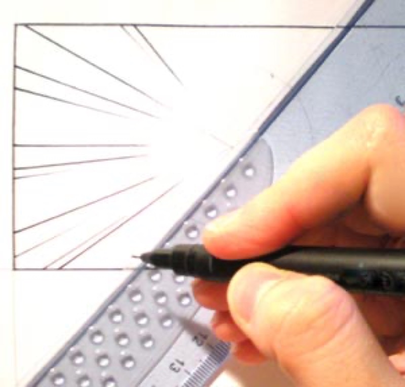 Traza una raya con la regla: Tienes que empezar desde fuera (el borde del círculo) e ir hacia dentro (el centro del círculo). Al acercarte al centro del círculo, reduce la presión del bolígrafo para obtener un trazo afilado.
