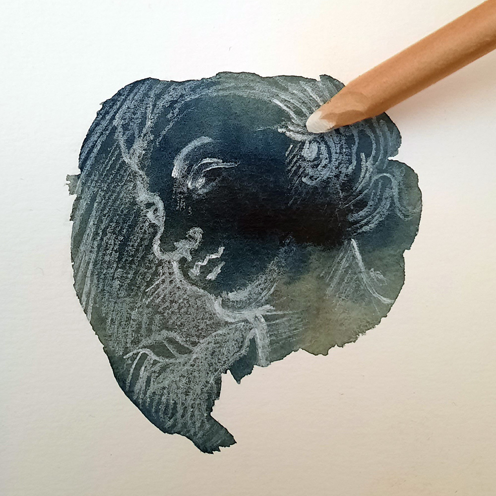 El truco extra: utilizar un fondo oscuro de acuarela te permitirá dibujar con lápiz blanco, como si trabajaras en negativo. Usa un lápiz pastel y prueba antes su opacidad y tono: algunos son menos cubrientes o presentan diferentes matices de blanco.
