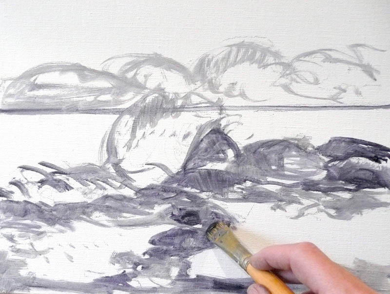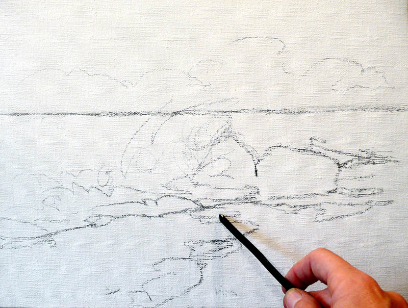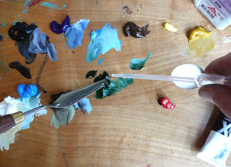 - Lápices y pinceles: 1 carboncillo, 2 brochas planas en sedas de cerdo (Pébéo), 1 cuchillo de pintar mediano (Pébéo 3026), 1 cuchillo de pintar de hoja fina (Talens 3007)