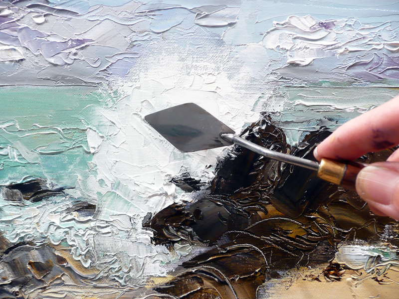 La marina es un tema que se presta muy ventajosamente a las múltiples posibilidades que ofrece la técnica de la pintura con cuchillo. Empastes, desplazamientos de colores, efectos de texturas, rascados, huellas y resaltos proporcionan una gran libertad de expresión y de creatividad. Disfrutarás plasmando la energía del agua y de un cielo en movimiento.