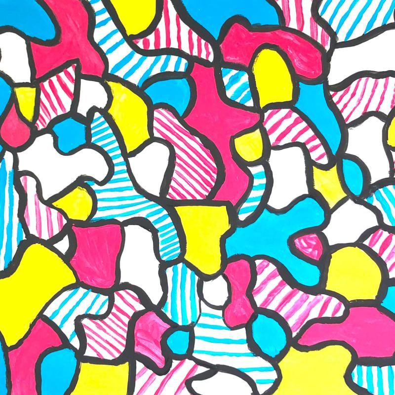 Proporciona a cada persona una hoja en blanco de Canson® Colorline®. Explícales que van a pintar siguiendo el estilo de Jean Dubuffet. Para ello, dibujarán curvas por toda la página utilizando gouache negra. A partir de ahora, solo se podrán utilizar los colores rojo, amarillo y azul. Explícales que sus obras tendrán que estar compuestas en su totalidad por formas pintadas, sombreadas y vacías.