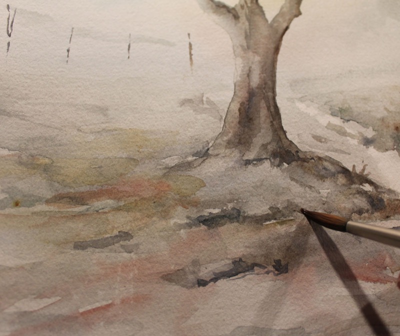 - Colores: acuarela extrafina Maimeri, gris de Payne, azul índigo, ocre amarillo, terracota, tierra verde, azul ultramar, marrón.