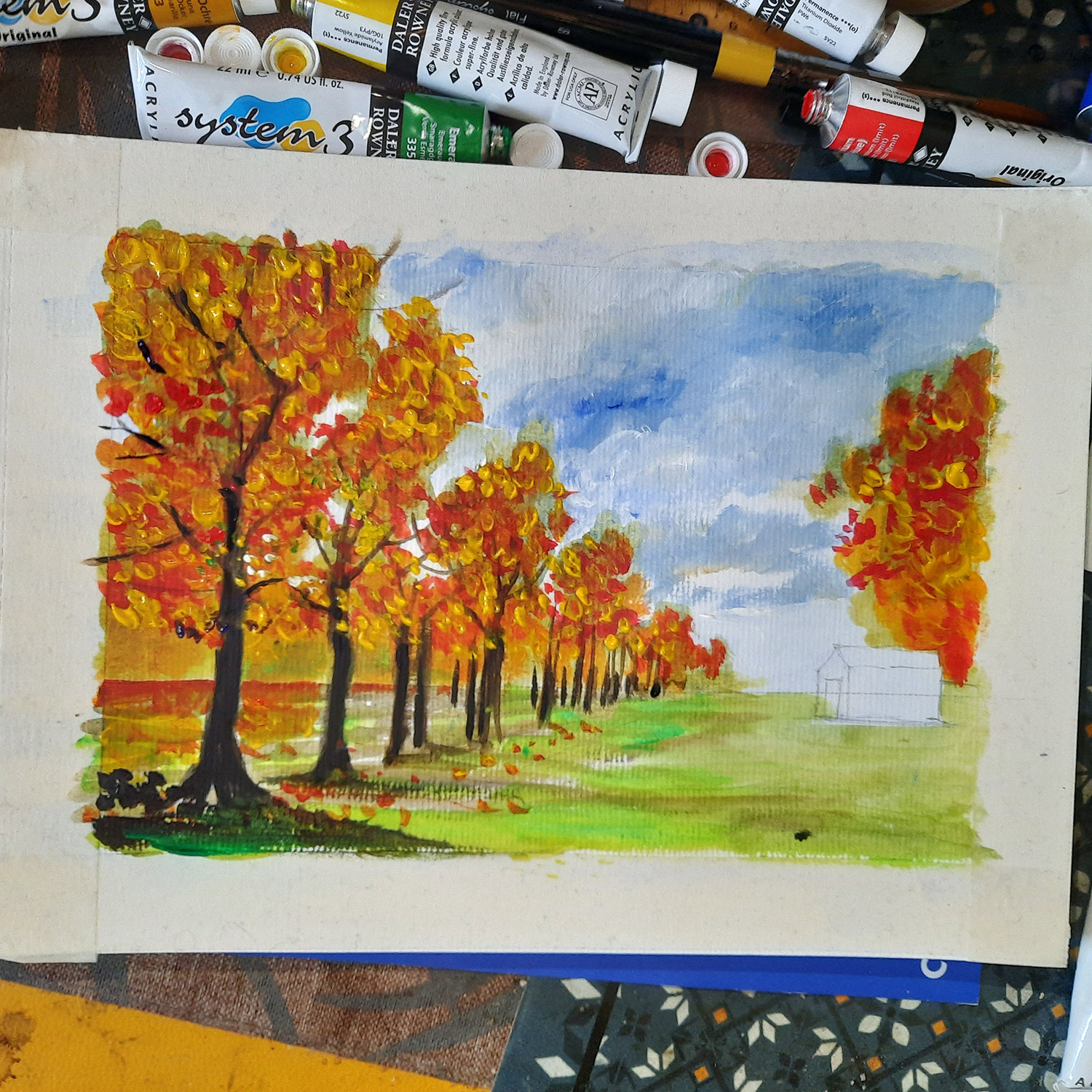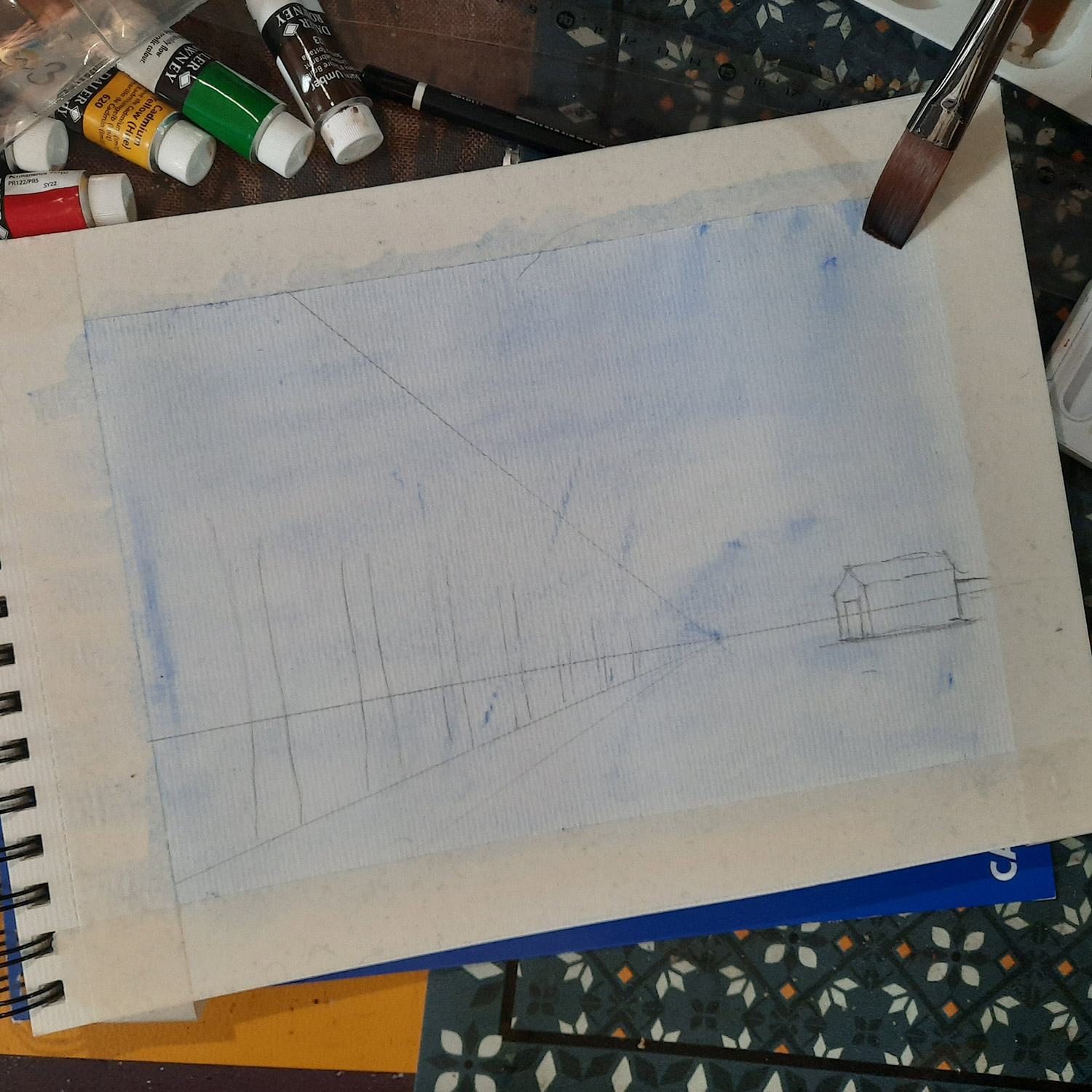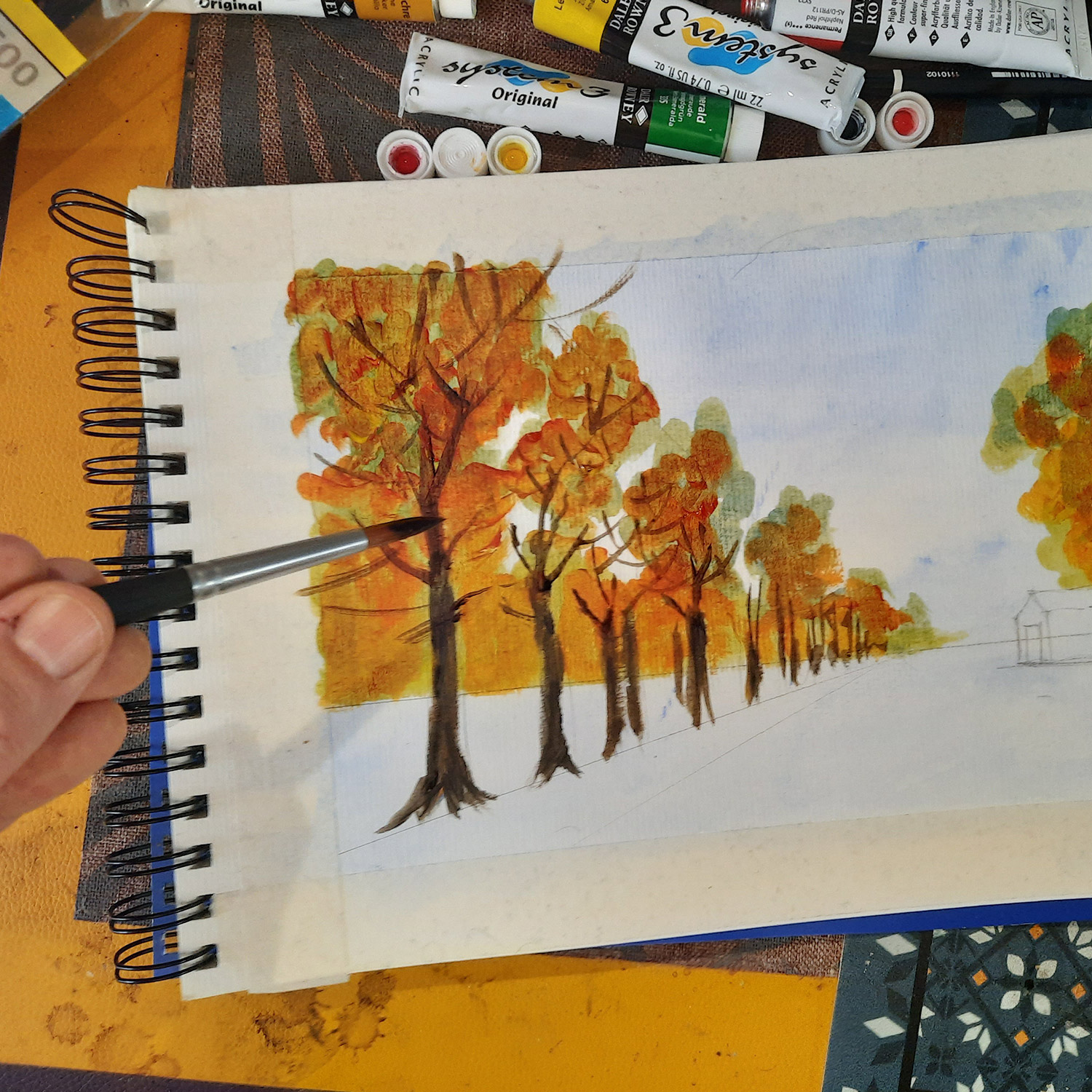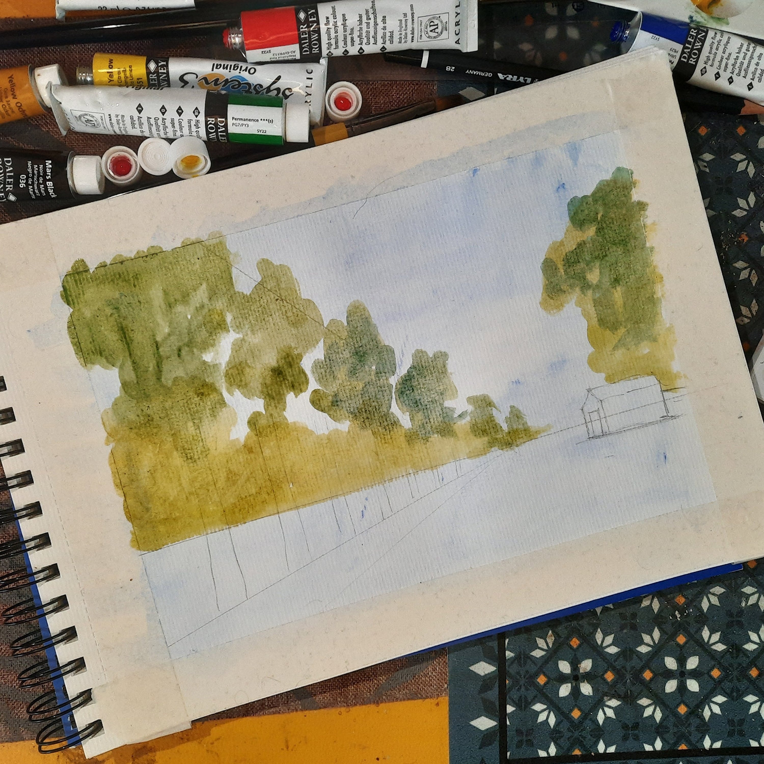 - Colores: set de 10 colores Daler Rowney Acrylic System 3, acuarelas Daler Rowney Aquafine para el fondo azul.