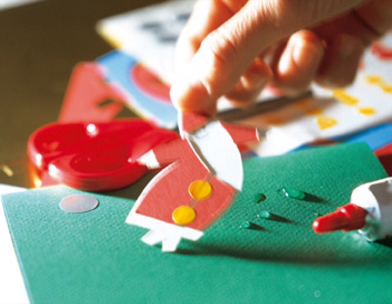 Necesitarás un pegamento en barra para las grandes superficies. Para pegar cosas precisas, utiliza un pegamento líquido con boquilla fina o "glue dots" (puntos de pegamento muy prácticos para fijar los adornos).