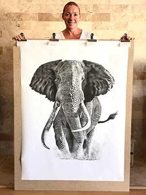 “Me esfuerzo por sobrepasar los límites del realismo haciendo uso de carbón y grafito. Me encantan estos medios por el dramatismo y el contraste que puedo crear. Para mí es importante sentir un desafío continuo. Mi objetivo es captar el sujeto de una forma inmersiva y en primer plano para que uno pueda mirar fijamente el alma de esa persona o animal. Creo que la conexión emocional es mucho mayor de esa manera.
